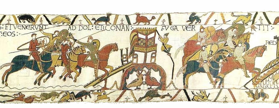 The Latin text above these sections of the Bayeux Tapestry refer to a battle that preceded the invasion of England, of the retreat of Duke Conan to the Castle Dinan and of his surrender to William.